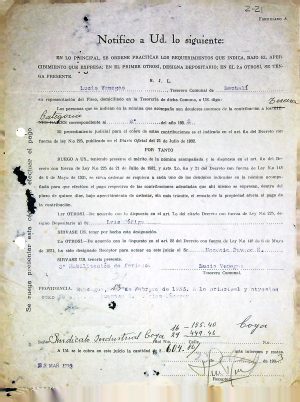 Notificación de deuda de impuestos a sindicato industrial – Marzo 1933