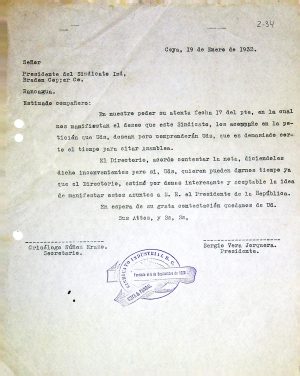 Respuesta a presidente de Sindicato Industrial Rancagua – Enero 1933