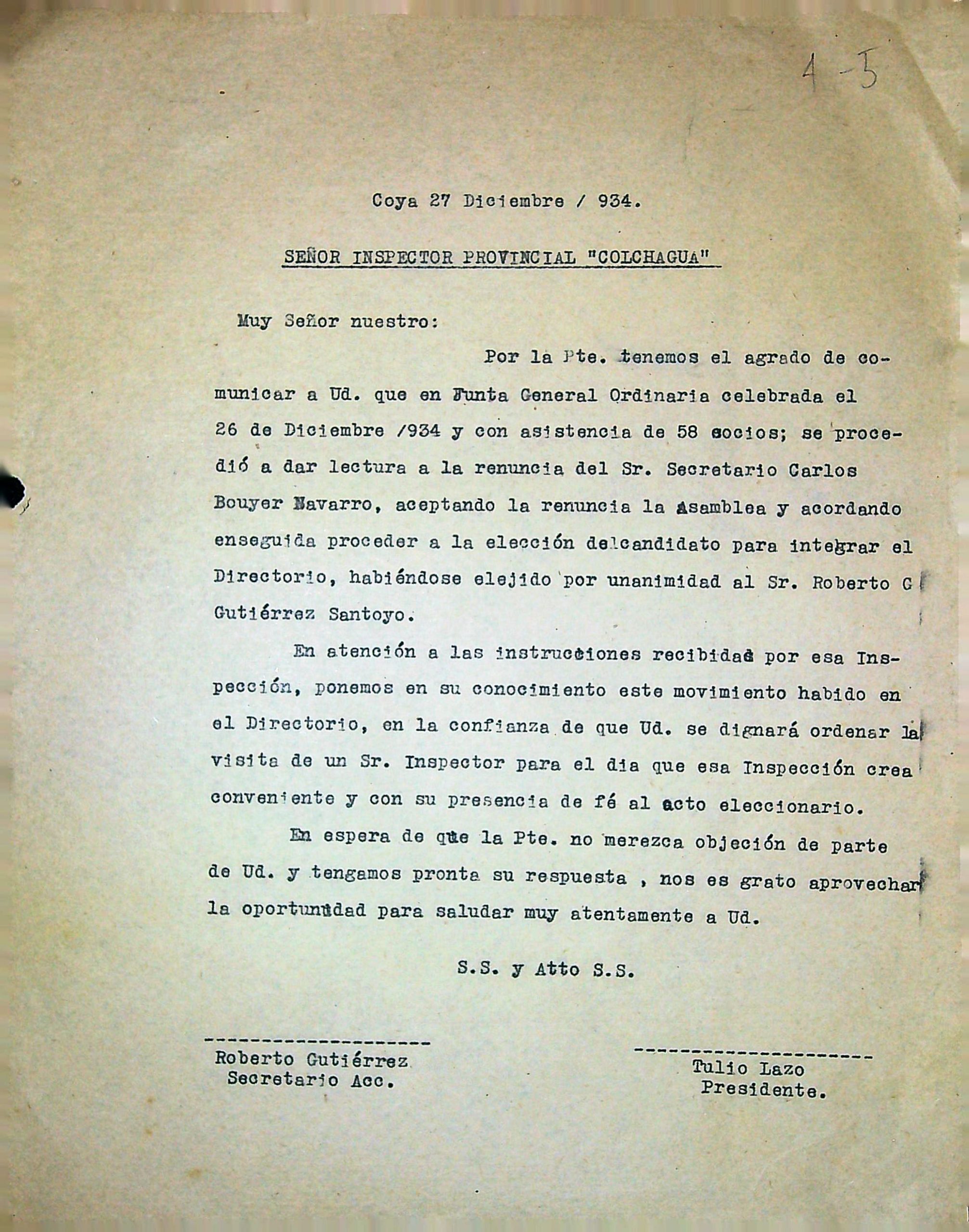 Carta a dirección provincial del trabajo por renuncia de secretario y elección de reemplazante – 1934